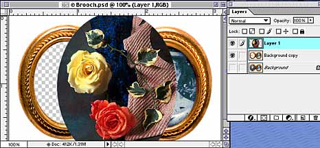 Back to your broach, go to EDIT/PASTE. Note that any time you paste, Photoshop will automatically past into a new layer directly above the layer you have active. For this image you need to move the layer you just pasted so it is under the frame layer. Don’t worry if your pasted image is too large or too small. We’ll fix that next.